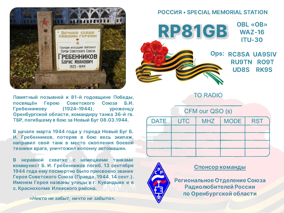 Operational Details: 📻 Call Sign: RP81GB 🎖️ Dedication: 81st Anniversary of Victory / Hero of the Soviet Union B.I. Grebennikov 🌐 Bands: All HF bands 🎙️ Modes: CW, SSB, DIGI 👥 Operators (Ops): RC8SA, UA9SIV, RU9TN, RO9T, UD8S, RK9S 📍 Region: OBL «OB» (Orenburg Region) 🏢 Sponsor: Regional Branch of the Union of Radio Amateurs of Russia in Orenburg Region